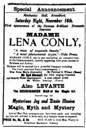 Fortunately I had saved some money, for I can assure you that many times, if I had been depending upon the amount of money I earned from doing magic, I would have gone to bed hungry. When Selwyn arranged for me to go on tour [November 1912] with a Madam Lena Conly, an oratoric soprano who came from Victoria and was doing a tour, it was necessary for me to buy some clothes, for I had been working around in my ordinary street clothes. I went to a second-hand shop and purchased a suit of tails and went away on tour with Madam Lena Conly and she had a great deal to do with teaching me how to use the right knife and fork, how to tie a white bow by hand and, generally, how to deport myself as a good performer.The builder of Luna Park, T.H Eslick, came to me one night and said to me, "I'm going to build a park in Sydney called the White City. How would you like to come over there and handle the Theatre of Illusions?" I said, "I think that would be delightful." So he said, "But, in the meantime, would you like to come over and be my 'tiger'?" I said to him, "Well, what do you mean by 'tiger'?" He said, "Well, I've got to have someone to run the messages and to generally make sure that the people who come to see me are on business and that sort of thing. I shall employ you at £4 per week and you can have about three months before White City opens." Of course, I agreed, and in the meantime I had to do some other work, and I was booked by Tom Selwyn to go to Broken Hill to what was then known as the Sods Opera, which was sort of a tough Music Hall which was run by a man named [Ross?] Hayward. I played there for a month and then went across to Western Australia to the then Shaftesbury Theatre, Perth, and played there. In those days, of course, there was no railway and I had to go there and back by steamer. I was then sent up to Kalgoorlie and played there and finally came back to Melbourne where I did some more work around the suburbs and then over to Sydney in [November] 1913 where I became the Tiger for T.H Eslick at the White City in Sydney, which was then being constructed.”