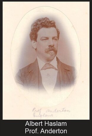 Selwyn would later claim (6) to have given his first magic show at the age of nine (1887) in Manchester, but all we know of his magical training comes from a photograph and pencilled note (5) stating that John had seen the magician Professor Anderton as a boy. Anderton’s real name was Albert A. Haslam, c.1851-Aug 5 1900 – a minor sleight of hand artist at English fairs until c.1890, when he left magic to become a circus worker and later a movie exhibitor. He lived at Sheffield, not a great distance from Manchester, but there is little reason to suspect that he was ever a mentor to young John.